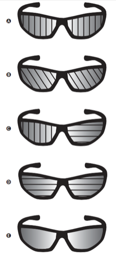Nas rodovias, é comum motoristas terem a visão ofuscada ao receberem a luz refletida na água empoçada no asfalto. Sabe-se que essa luz adquire polarização horizontal. Para solucionar esse problema, há a possibilidade de o motorista utilizar óculos de lentes constituídas por filtros polarizadores. As linhas nas lentes dos óculos representam o eixo de polarização dessas lentes.