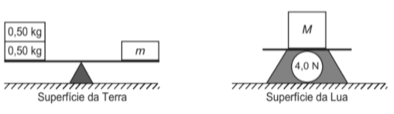A figura mostra uma balança de braços iguais, em equilíbrio, na Terra, onde foi colocada uma massa m, e a indicação de uma balança de força na Lua, onde a aceleração da gravidade é igual a 1,6 m/s2, sobre a qual foi colocada uma massa M.