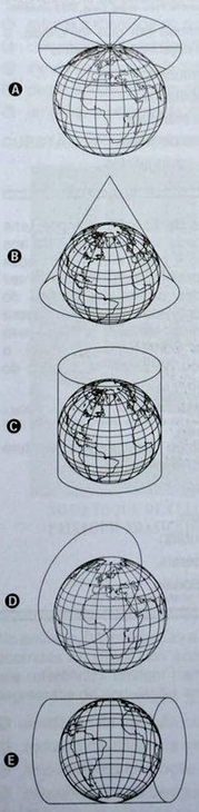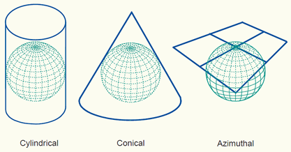 Vamos relembrar os outros tipos principais de projeção cartográfica: