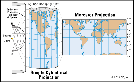 A projeção de mercator é a cilíndrica simples e busca manter os contornos das formas dos países e continentes, por mais que essa precisão diminua a área dos países próximos ao equador, e aumente as áreas dos países longe do equador.
