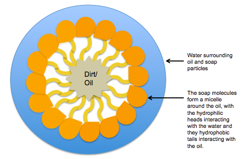 Veja o que acontece com o sabão ao redor de uma partícula de óleo: a parte apolar se aproximará do óleo, e serão formadas micelas, explicadas em detalhe aqui na questão do ENEM sobre surfactantes e micelas.