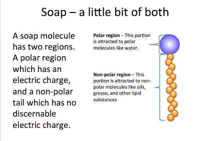 Veja em uma molécula de sabão: parte polar (esfera roxa) e apolar (cadeira carbônica) representada pelas esferas pequenas amarelas.