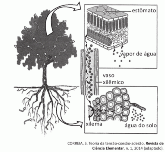 A figura ilustra o movimento da seiva xilêmica em uma planta.