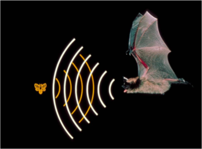 O morcego utiliza a mesma técnica de emissão de ultrassom, seguido da recepção e interpretação do sinal, para que dessa forma ele consiga se localizar e pegar sua presa. Então teremos as ondas emitidas e as ondas refletidas.