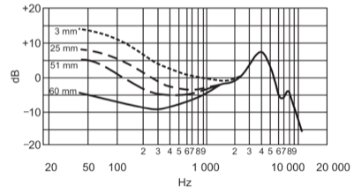 O aumento da distância do microfone ao alto-falante desde 3 a 60 mm provoca uma diminuição dos decibéis, diminuindo a intensidade sonora.