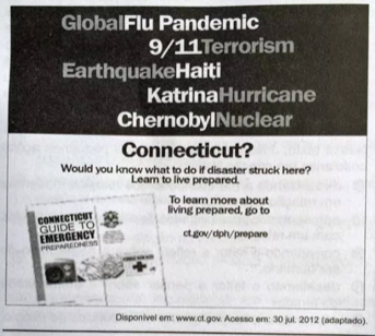 O cartaz mostra tragédias que ocorrem no mundo com a ideia de incentivar a população a se informar sobre medidas de preparação, ou seja, o que fazer no caso de emergências. O site terá medidas de emergência a serem tomadas.