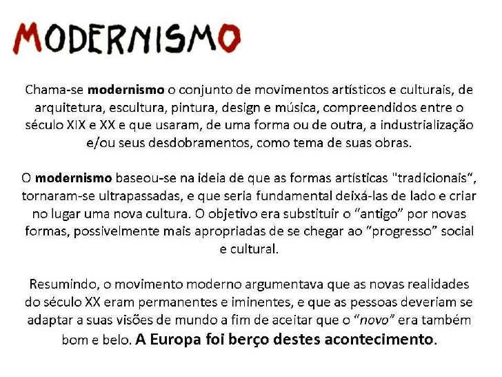 O modernismo surgiu na Europa e foi trazido ao Brasil. Aqui no Brasil o movimento modernista foi adaptado à realidade local. Então ocorre uma fusão de elementos da cultura brasileira com a arte europeia.