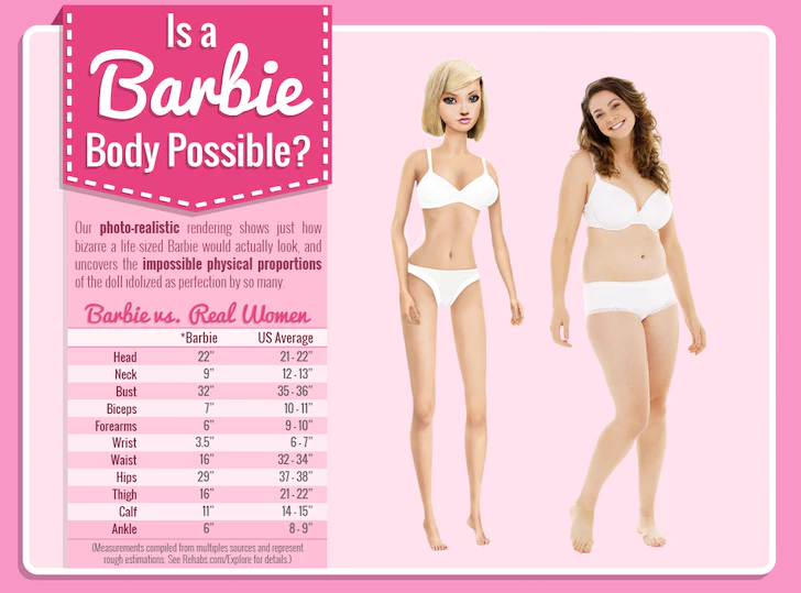 Apesar de muitas crianças e adolescentes terem a Barbie como um exemplo de beleza, um infográfico feito pelo site Rehabs.com comprovou que, caso uma mulher tivesse as medidas da boneca de plástico, ela nem estaria Viva.