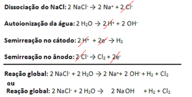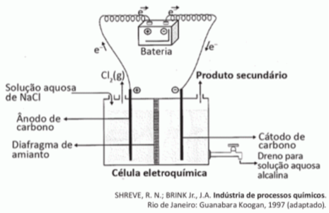 A eletrólise é um processo não espontâneo de grande importância para a indústria química. Uma de suas aplicações é a obtenção do gás cloro e do hidróxido de sódio, a partir de uma solução aquosa de cloreto de sódio. Nesse procedimento, utiliza-se uma célula eletroquímica, como ilustrado.