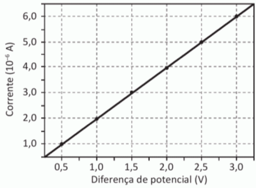 Sabemos que a equação para a DDP é U=R.i. Pegando um ponto qualquer do gráfico conseguiremos calcular a resistência nominal. Pegando os pontos (i=6.10-6; e U = 3V) temos: