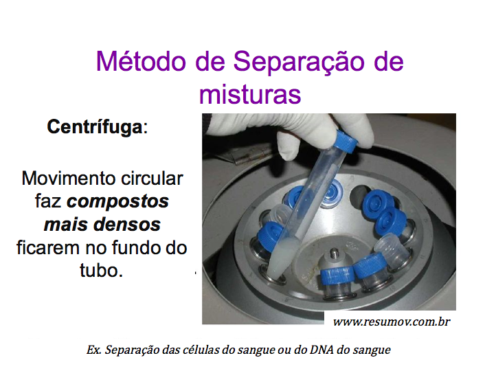 A centrifugação é um processo de separação de substâncias por densidades sob movimento rotacional: a substância de maior densidade vai para o fundo do tubo e a menos densa para a suberfície.