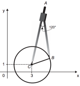 Uma desenhista projetista deverá desenhar uma tampa de panela em forma circular. Para realizar esse desenho, ela dispõe, no momento, de apenas um compasso, cujo comprimento das hastes é de 10 cm, um transferidor e uma folha de papel com um plano cartesiano. Para esboçar o desenho dessa tampa, ela afastou as hastes do compasso de forma que o ângulo formado por elas fosse de 120o. A ponta seca está representada pelo ponto C, a ponta do grafite está representada pelo ponto B e a cabeça do compasso está representada pelo ponto A conforme a figura.