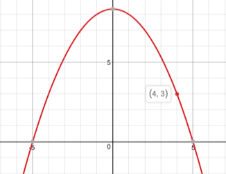 Podemos escrever a igreja na forma de parábola. As raízes da parábola serão: (5,0) e (-5,0). A questão nos dá também o ponto (x, y) = (4, 3)