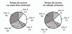 Quanto tempo você fica conectado à internet? Para responder a essa pergunta foi criado um miniaplicativo de computador que roda na área de trabalho, para gerar automaticamente um gráfico de setores, mapeando o tempo que uma pessoa acessa cinco sites visitados. Em um computador, foi observado que houve um aumento significativo do tempo de acesso da sexta-feira para o sábado, nos cinco sites mais acessados. A seguir, temos os dados do miniaplicativo para esses dias.