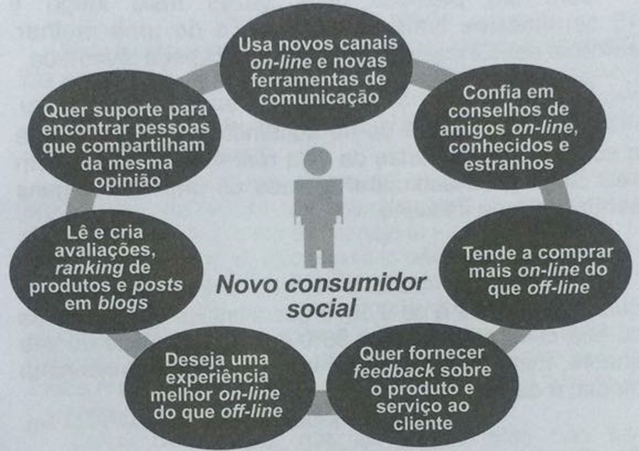 O consumidor do século XXl, chamado de novo consumidor social, tende a se comportar de modo diferente do consumidor tradicional. Pela associação das características apresentadas no diagrama, infere-se que esse novo consumidor sofre influência da