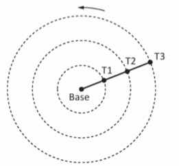 Um pivô de três torres (T1, T2, e T3) será instalado em uma fazenda, sendo que as distâncias entre torres consecutivas bem como da base à torre T1 são iguais a 50 m. O fazendeiro pretende ajustar as velocidades das torres, de tal forma que o pivô efetue uma volta completa em 25 horas. Use 3 como aproximação para pi. Para atingir seu objetivo, as velocidades das torres T1 T2 e T3 devem ser, em metro por hora, de