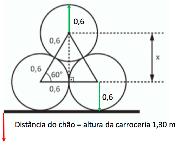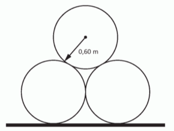 Considere que o raio externo de cada cano da imagem seja 0,60 m e que eles estejam em cima de uma carroceria cuja parte superior está a 1,30 m do solo. O desenho representa a vista traseira do empilhamento dos canos.