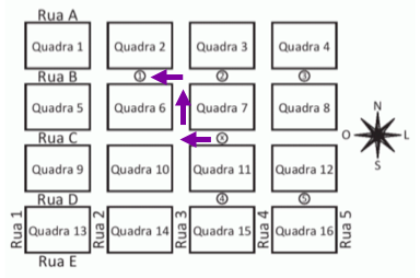 Um menino acaba de se mudar para um novo bairro e deseja ir à padaria. Pediu ajuda a um amigo que lhe forneceu um mapa com pontos numerados, que representam cinco locais de interesse, entre os quais está a padaria. Além disso, o amigo passou as seguintes instruções: a partir do ponto em que você se encontra, representado pela letra X, ande para oeste, vire à direita na primeira rua que encontrar, siga em frente e vire à esquerda na próxima rua. A padaria estará logo a seguir.