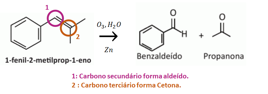 “Ligações duplas dissubstituídas geram cetonas (terciário), enquanto as ligações duplas terminais (primário) ou monossubstituídas (secundários) dão origem a aldeídos. ”