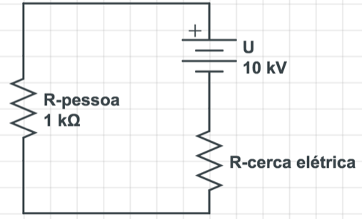 Em algumas residências, cercas eletrificadas são utilizadas com o objetivo de afastar possíveis invasores. Uma cerca eletrificada funciona com uma diferença de potencial elétrico de aproximadamente 10 000 V. Para que não seja letal, a corrente que pode ser transmitida através de uma pessoa não deve ser maior do que 0,01 A. Já a resistência elétrica corporal entre as mãos e os pés de uma pessoa é da ordem de 1000 (2. Para que a corrente não seja letal a uma pessoa que toca a cerca eletrificada, o gerador de tensão deve possuir uma resistência interna que, em relação à do corpo humano, é
