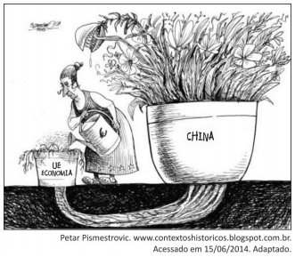 Na charge, uma senhora carrega um balde com “euros”, ela rega a União Europeia, mas quem absorve esta “nutrição” é a China, através de suas raízes subterrâneas. Vale citar que a planta chinesa é carnívora, o que dá uma ideia da agressividade de sua economia, além disso, está em muito melhor forma que a UE. Esta parece uma planta seca com dificuldade para crescer.