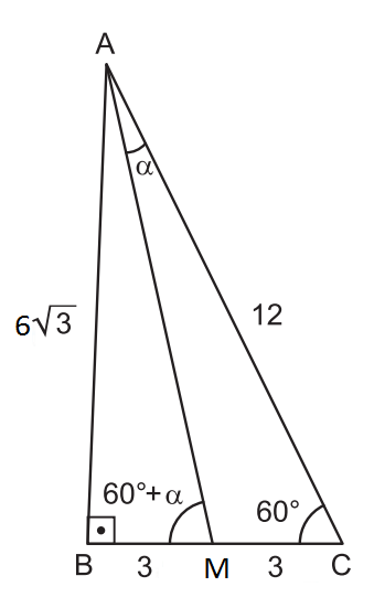 No triângulo retângulo ABC, ilustrado na figura, a hipotenusa AC mede 12 cm e o cateto BC mede 6 cm. Se M é o ponto médio de BC, então a tangente do ângulo MÂC é igual a