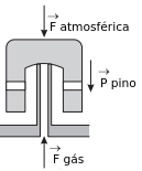 57 Para impedir que a pressão interna de uma panela de pressão ultrapasse um certo valor, em sua tampa há um dispositivo formado por um pino acoplado a um tubo cilíndrico, como esquematizado na figura ao lado. Enquanto a força resultante sobre o pino for dirigida para baixo, a panela está perfeitamente vedada. Considere o diâmetro interno do tubo cilíndrico igual a 4 mm e a massa do pino igual a 48 g. Na situação em que apenas a força gravitacional, a pressão atmosférica e a exercida pelos gases na panela atuam no pino, a pressão absoluta máxima no interior da panela é