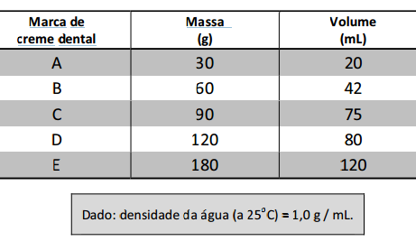 70. Cinco cremes dentais de diferentes marcas têm os mesmos componentes em suas formulações, diferindo, apenas, na porcentagem de água contida em cada um. A tabela a seguir apresenta massas e respectivos volumes (medidos a 25° C) desses cremes dentais.