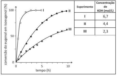 Foram feitos três experimentos de isomerização, à mesma temperatura, empregando-se massas iguais de eugenol e volumes iguais de soluções alcoólicas de KOH de diferentes concentrações. O gráfico a seguir mostra a porcentagem de conversão do eugenol em isoeugenol em função do tempo, para cada experimento.