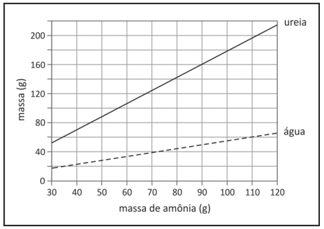 75 Amônia e gás carbônico podem reagir formando ureia e água. O gráfico ao lado mostra as massas de ureia e de água que são produzidas em função da massa de amônia, considerando as reações completas. A partir dos dados do gráfico e dispondo-se de 270 g de amônia, a massa aproximada, em gramas, de gás carbônico minimamente necessária para reação completa com essa quantidade de amônia é