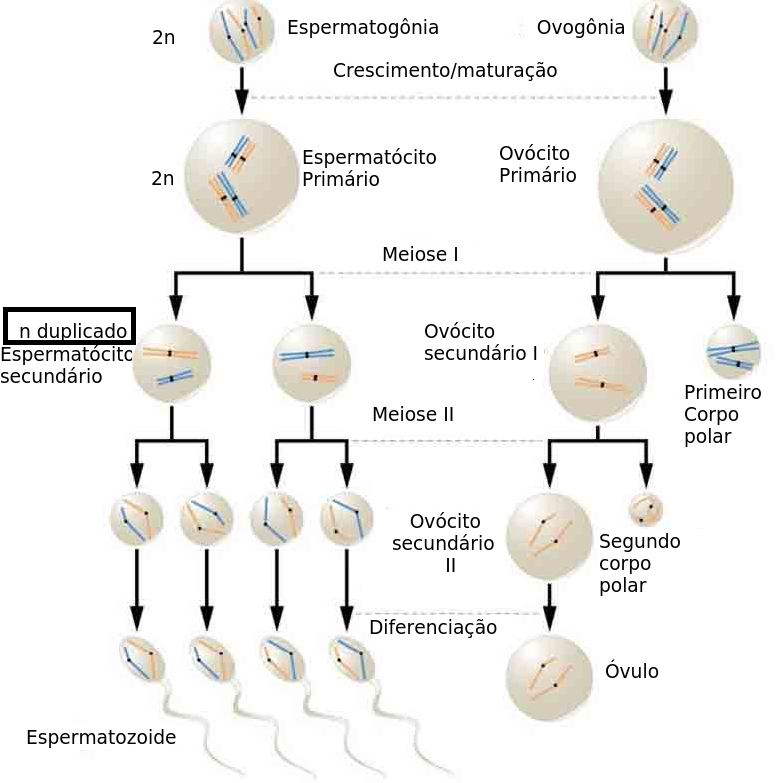 Tanto os espermatócitos quanto os ovócitos secundários possuem “n” cromossomos. No entanto, como estão duplicados, eles contém a mesma quantidade de DNA de uma ovogônia ou de uma espermatogônia. Em uma ovogônia ou esspermatogônia, no período G1 da interfase existem “2n” cromossomos simples, ou seja, cromossomos que não duplicados.