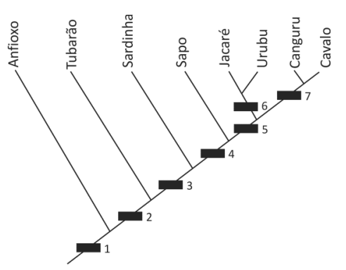 Essa árvore representa a simplificação de uma das hipóteses para as relações evolutivas entre os grupos a que pertencem os animais exemplificados. Os retângulos correspondem a uma ou mais características que são compartilhadas pelos grupos representados acima de cada um deles na árvore e que não estão presentes nos grupos abaixo deles. A presença de notocorda, de tubo nervoso dorsal, de vértebras e de ovo amniótico corresponde, respectivamente, aos retângulos
