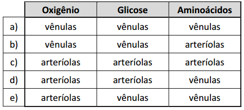 90 No intestino humano, cada uma das vilosidades da superfície interna do intestino delgado tem uma arteríola, uma vênula e uma rede de capilares sanguíneos. Após uma refeição, as maiores concentrações de oxigênio, glicose e aminoácidos no sangue são encontradas nas