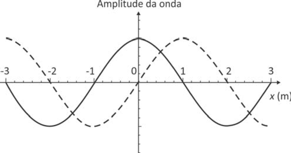 A figura representa uma onda harmônica transversal, que se propaga no sentido positivo do eixo x, em dois instantes de tempo: t = 3 s (linha cheia) e t = 7 s (linha tracejada).