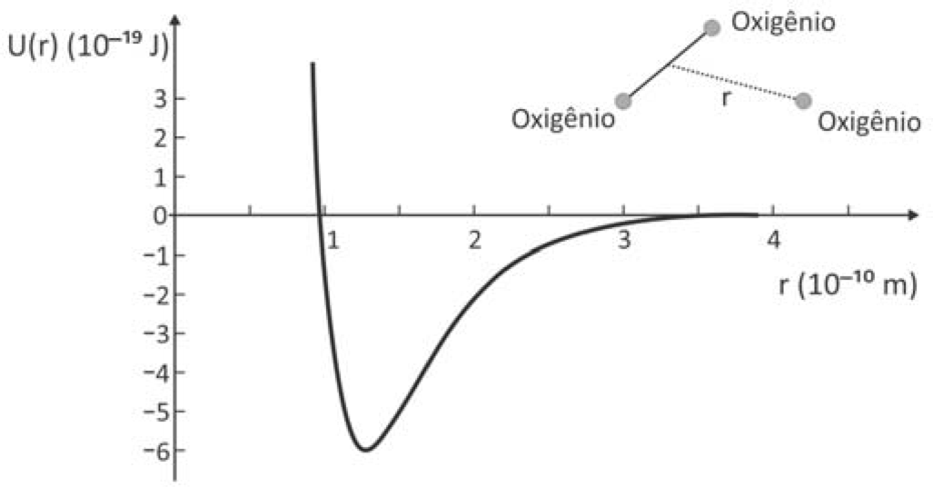 O gráfico representa a energia potencial de ligação entre um dos átomos de oxigênio que constitui a molécula de O3 e os outros dois como função da distância de separação r.