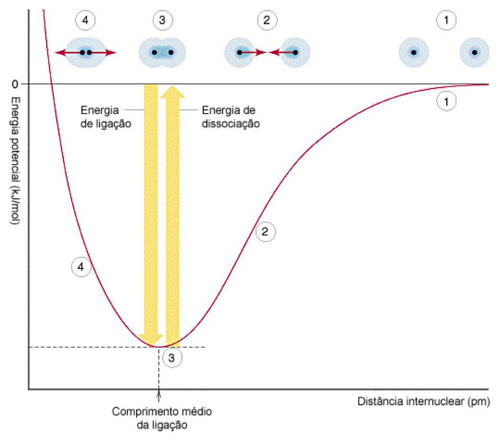 Na situação 1 os dois átomos estão muito afastados um do outro, praticamente não há atração entre eles e a energia potencial entre eles é quase nula; na situação 2 eles estão pouco afastados, propiciando a atração entre eles, o que torna a energia total dos dois átomos menor que a da situação 1 e, portanto, mais estável; na situação 3 temos o comprimento médio de ligação e neste ponto considera-se que a ligação covalente está formada. Há um equilíbrio entre as forças de atração e as forças de repulsão e a energia potencial da molécula é mínima; na situação 4 a repulsão entre os núcleos começa a ser maior que as atrações entre os elétrons e os núcleos, aumentando a instabilidade da molécula e a sua energia potencial.