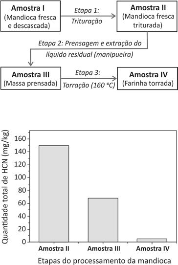 Após cada etapa do processamento para a produção de farinha de mandioca seca, representado pelo esquema a seguir, quantificou se o total de HCN nas amostras, conforme mostrado no gráfico que acompanha o esquema.