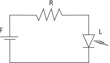Atualmente são usados LEDs (Light Emitting Diode) na iluminação doméstica. LEDs são dispositivos semicondutores que conduzem a corrente elétrica apenas em um sentido. Na figura, há um circuito de alimentação de um LED (L) de 8 W, que opera com 4 V, sendo alimentado por uma fonte (F) de 6 V.