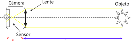 Do enunciado temos que distância focal (f) é igual a +20mm, pois a lente é convergente. O objeto é real, portanto a distância (p) entre a lente e o objeto é +2000mm (2m=2000mm) e a distância (p’) entre a imagem formada – que deve se formar no sensor da câmera quando corretamente focalizada – e a lente é o que queremos determinar.