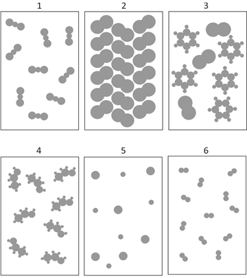 Considere as figuras pelas quais são representados diferentes sistemas contendo determinadas substâncias químicas. Nas figuras, cada círculo representa um átomo, e círculos de tamanhos diferentes representam elementos químicos diferentes.