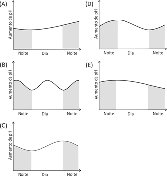 Portanto, no gráfico devemos ter uma curva em que há um aumento do pH no período do dia e diminuição com a chegada da noite. Assim a B, D e E não podem ser já que mostram diminuições do pH durante o dia e A (assim como a B, a D e a E), também não, já que mostram aumento do pH durante a noite. Sendo assim, a resposta correta é a alternativa C.