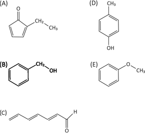 Ainda no teste I, ao adicionar uma gota de ácido e uma pequena quantidade de um forte oxidante, ocorreu a oxidação da substância que formou o composto branco insolúvel em água fria e que em água quente mostrou ter caráter ácido (pH<7). Portanto, as alternativas A (2-etil-ciclopentadienona) e E (Metoxibenzeno ou Anisol) podem ser eliminadas, já que os grupos funcionais cetona e éter não oxidam.