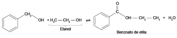 II. O sólido branco, obtido no teste anterior, foi dissolvido em etanol e a solução foi aquecida na presença de um catalisador. Essa reação produziu benzoato de etila, que é um éster aromático, de fórmula C9H10O.