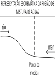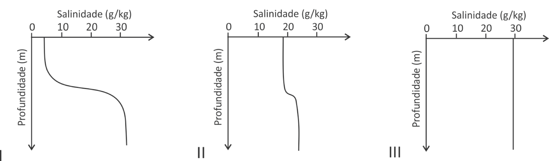 Medidas de salinidade da água em função da profundidade foram realizadas em um ponto equivalente para esses três tipos de estuários, conforme mostrado no esquema a seguir, gerando os gráficos I, II e III.