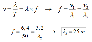 Como a frequência de uma onda não se modifica ao longo de sua propagação, podemos utilizar a fórmula para calculo da velocidade de propagação de uma onda para determinar o comprimento da onda na menor profundidade: