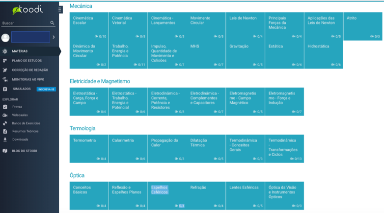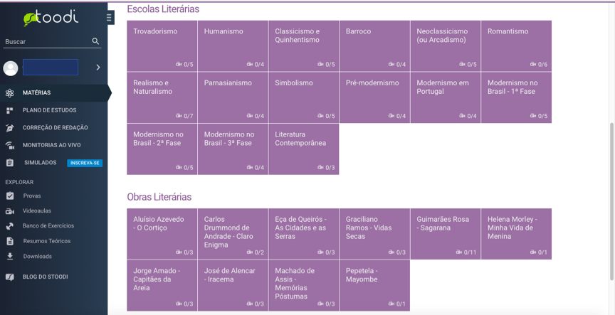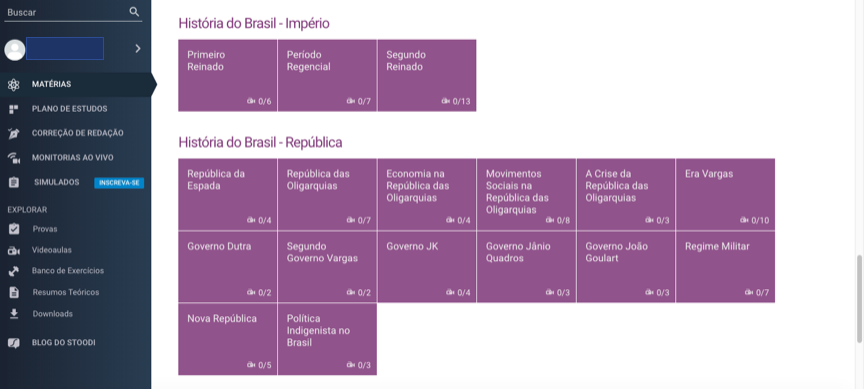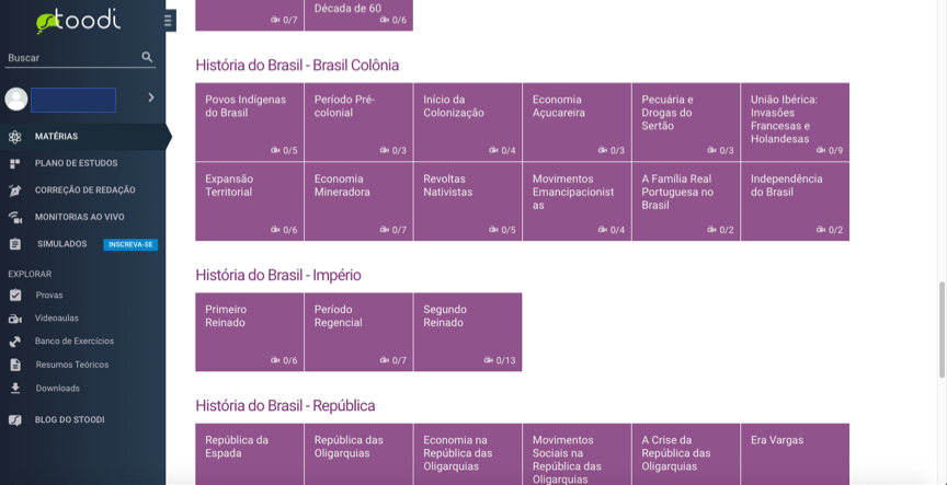 Agora vou mostrar o que você encontra no site ao entrar na área exclusiva dos alunos em algumas matérias: História, Física, Literatura.