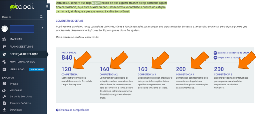 Mas ainda assim, a correção exemplo parece ser muito boa, você consegue ver sua nota em cada competência.